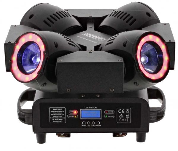 La 4lyre Beam 50 Ring avec anneau. Quadruple lyre à faisceau beam dotée de 4 puissantes Leds de 50W RGBW 4-in-1 chacune couronnée d’anneau décoratif à led très novateur. Les mouvements rapides, la qualité des couleurs et les teintes obtenues permettent de produire de surprenants effets dynamiques. Elle est dotée d’un strobe, de deux modes DMX, d’un mode Auto et Musical. D’une efficacité redoutable. D’une efficacité redoutable, elle est idéale pour une installation en club, bar, scène et sera ravir les DJs et animateurs.