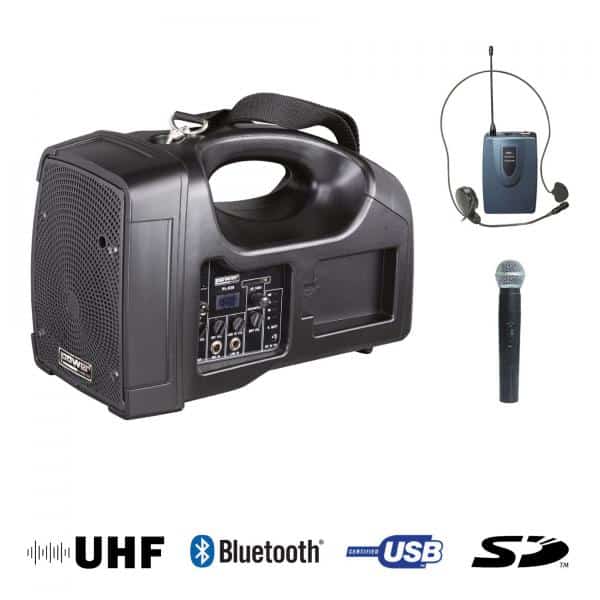 le BE 1400 Pt UHF est une sono portable équipée d’un Micro main et un body Serre tête.