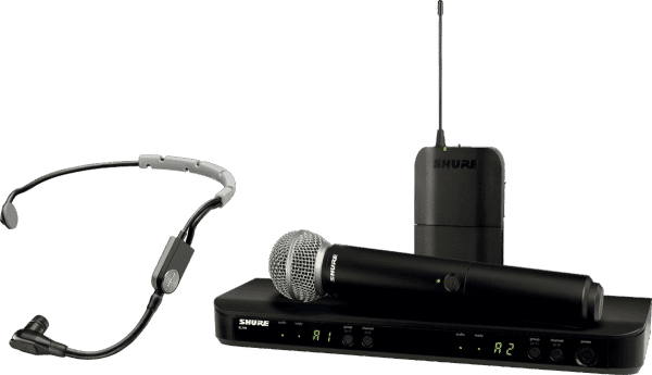 Composé d’un récepteur double BLX88E, d’un émetteur main capsule SM58, d’un émetteur ceinture BLX1 et d’un micro serre-tête statique cardioïde SM35?TQG.