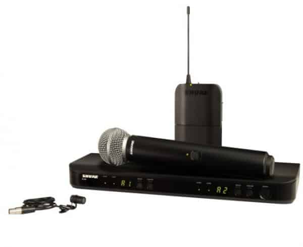 Ce système HF Shure est composé d’un récepteur double BLX88E, d’un émetteur main capsule SM58, d’un émetteur ceinture BLX1 et d’un micro cravate statique cardioïde WL185.