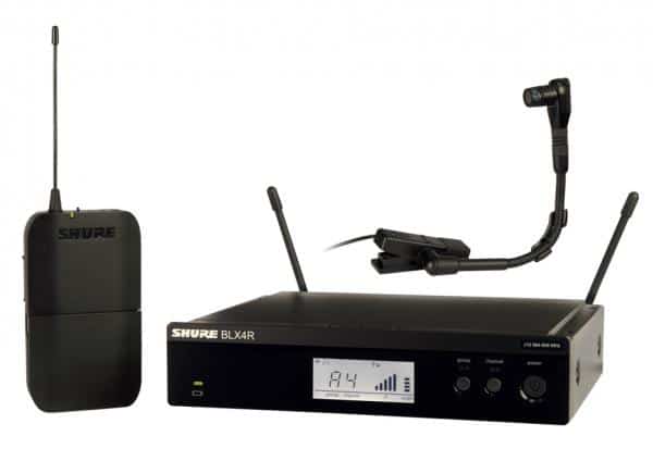 Composé d’un récepteur BLX4RE avec kit de montage en rack simple / double et report d’antennes en façade, d’un émetteur ceinture BLX1 et d’un micro instrument statique cardioïde avec pince intégrée WB98H/C.