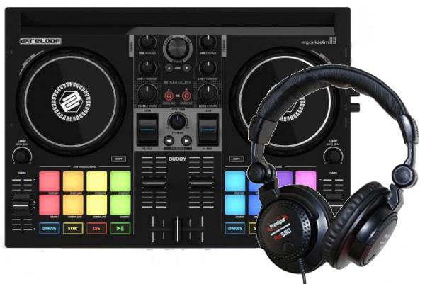 Le Reloop Buddy est un contrôleur dj pour iPad, Smartphone ,pc, mac avec un casque Prodipe Pro580.