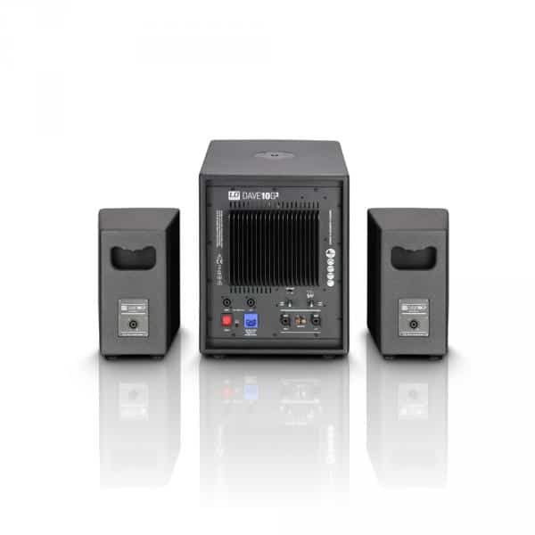 Le pack sono LD Systems Dave 10 G3 se compose d’un caisson de basses amplifié de type bass reflex avec 1 haut-parleur de 10″ et de 2 satellites avec haut-parleurs de 5,25″ et des tweeters d’1″. Les satellites sont alimentés par le module amplificateur du sub produisant 350 Watts RMS. Le LD LECC DSP assure sans latence à la fois les rôles de filtre, de limiteur et d’égaliseur tout en appliquant une compression dynamique.