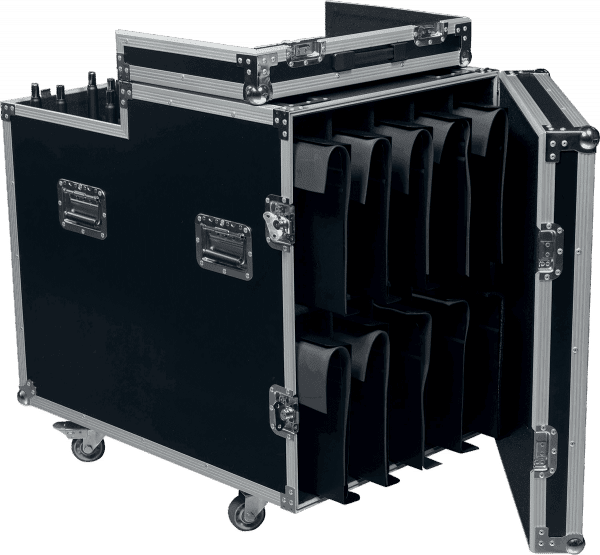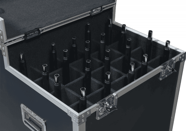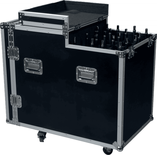 Ce flight-case peut stocker et de déplacer 20 pupitres Manhasset Voyager. L’intérieur est recouvert de moquette noire, permettant d’éviter les égratignures sur les pieds et les tables des pupitres.