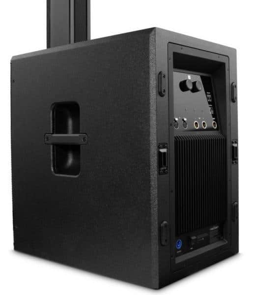 Caisson de basses à boîtier robuste en contreplaqué de bouleau avec revêtement en polyurée et colonne légère en aluminium thermolaqué.