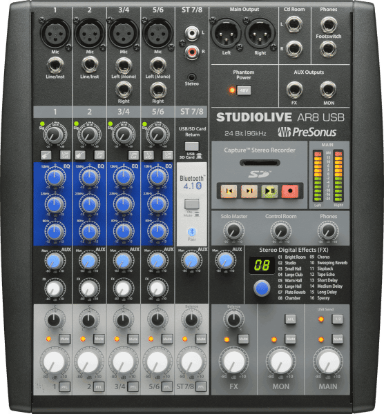 La Studiolive AR8 USB est une console de mixage hybride 8 canaux, équipée des prestigieux préamplis Presonus Class A et d’une EQ 3 bandes pour chaque canal.