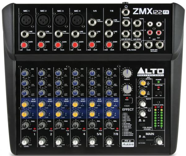 L’Alto Zephyr ZMX122FX est un mixeur 8 canaux, 2 bus avec toutes les entrées, sorties, routing et égaliseurs dont vous avez besoin pour vous assister dans des prestations live exigeantes. Elle regroupe 4 entrées microphones (avec alimentation fantôme) avec jacks TRS symétriques, un égaliseur trois bandes, 2 AUX sends sur chacun des quatre canaux mono et des deux canaux stéréo, et une entrée two-track.