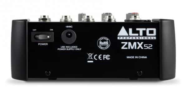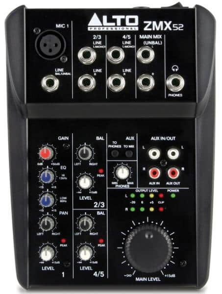 L’Alto Zephyr ZMX52 est un mixeur 5 canaux regroupant toutes les entrées, sorties et EQ nécessaires à la sonorisation live ou aux studios multimedia. Elle dispose d’un canal mono avec entrée microphone (avec alimentation fantôme), d’une entrée TRS symétrique, d’un égaliseur 2 bandes et d’un canal stéréo. Sont aussi présents deux canaux stéréo avec deux entrées TRS symétriques chacun. Le ZMX52 est un mixeur compact de qualité professionnelle idéal à transporter.